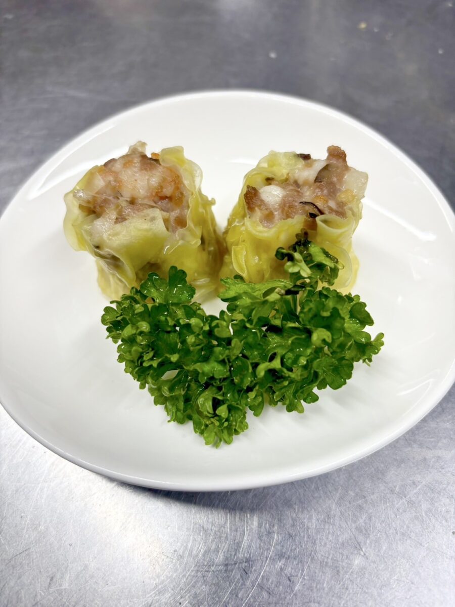 焼売は通常挽肉と玉ねぎですが今回は豚肩ロースむきえびをサイコロ状にカットしました食感を楽しみお召し上がりください。