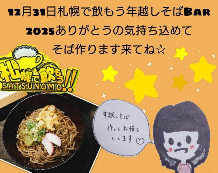 コミュニティBAR運営メッセージ札幌で飲もうコミュニティBARでは、「【札幌で飲もう!大晦日ナイトカウントダウン♫2024年-2025年ゆく年くる年企画】」を行います。年越し蕎麦ご希望の方は前日までに「そば希望」のご連絡くれると助かります!ドタ参加の場合は売り切れの場合がありますのでご了承願います(^^)