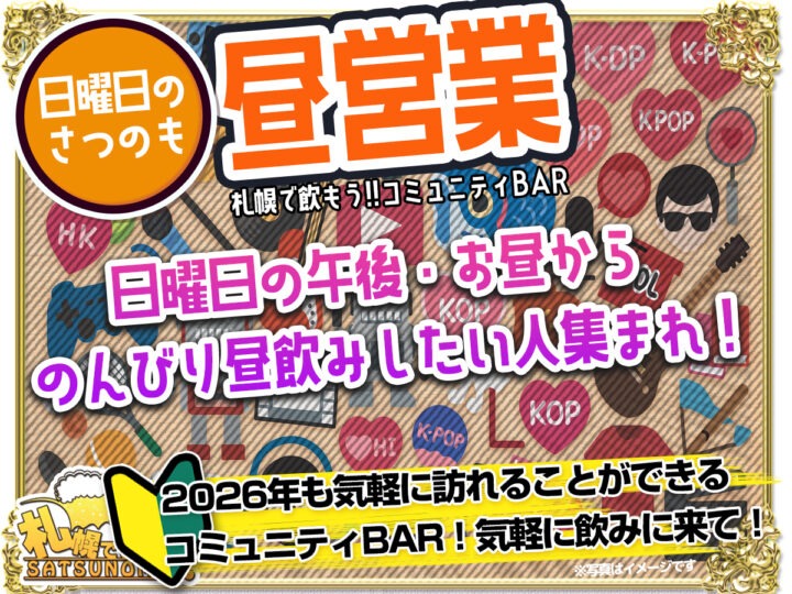 1月25日 日曜日 昼営業 12時~17時に、すすきのにある札幌で飲もう!!コミュニティBARで日曜日のさつのも昼営業!ゲーム、お昼寝⁉️などBARでまったりしよう が開催されます。