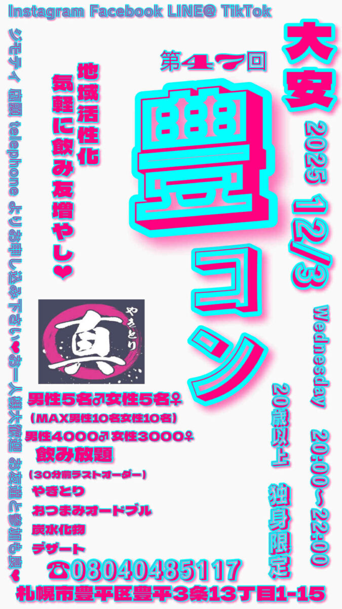 @piyopiyoko17 地域活性化❤︎ 気軽に飲み友増やし 『豊コン』 第44回 無事大成功開催 ありがとございます 2025-3/27THURSDAY大安 20:00〜22:00 独身限定❤︎ 今回は20歳以上ならどなたでも❤︎ 男性5名 女性5名 (MAX男性10名 女性10名) 男性¥4000 女性¥3000 飲み放題 やきとり オードブル 炭水化物 デザート ❤︎ 過去の様子 ↓↓↓↓↓ https://www.facebook.com/332770643582686/posts/804274103099002/ ❤︎ 普段はいたって普通のやきとり屋です 地域に密着 お客様に寄り添い 和気あいあい営業しております❤︎ そんな中 お客様の声がきっかけとなり 豊平で気軽に飲み友増やし 『豊コン』が生まれました❤︎ やきとり真のお客様 豊コンリピーター様 口コミ ご紹介 札幌で飲もう! http://www.satsu-nomo.com から お申し込み様 お陰様で毎回 色々な所から お集まり頂きまして 大盛り上がりでございます♪( ´▽`) Facebook LINE@ Instagram x ジモティなどで 随時情報更新しております(o^^o) Facebook http://facebook.com/yakitori.shin.n LINE@ Instagram x ジモティ 店頭 店電08040485117 〒0620903 札幌市豊平区豊平3条13丁目1-15 『豊コン』 まずは気軽に飲み友増やしっ! 出会いのきっかけの場になればっ!と… 楽しく和気あいあいの中 出会えば また会いたい! 飲みたい!もっとお話ししてみたい!に違いないって! 2度3度 と楽しい飲み会などして顔を合わせていくうちに… 恋愛モード発展〜なんて素敵な縁につながると 良いなという思い出で企画 しておりますo(^_-)O 1名様 大歓迎!ご紹介 大歓迎! 色々対応 サポートいたしますので 気になる方は是非お気軽にお問い合わせ下さい❤︎ 尚 キャンセルに ついてですが 素敵な良い出会いをより楽しんでもらえる様 お料理やゲームは毎回 思考をこらし 男性 女性 なるべく人数を合わせて 開催させていただいています(o^^o) キャンセル料はいただいておりません! やむを得なくご都合悪くなった場合や 体調不良のは場合は速やか 連絡いただくことをご理解いただいたうえで お申し込み下さいませ(o^^o) ❤︎ #豊コン#合コン#合同コンパ#パーティ#豊平#和気あいあい#やきとり#炭火#飲み放題#オードブル#デザート#地域活性化#楽しいコト#大好き#やきとり真#❤ ♬ オリジナル楽曲 - masaお疲れ様です
